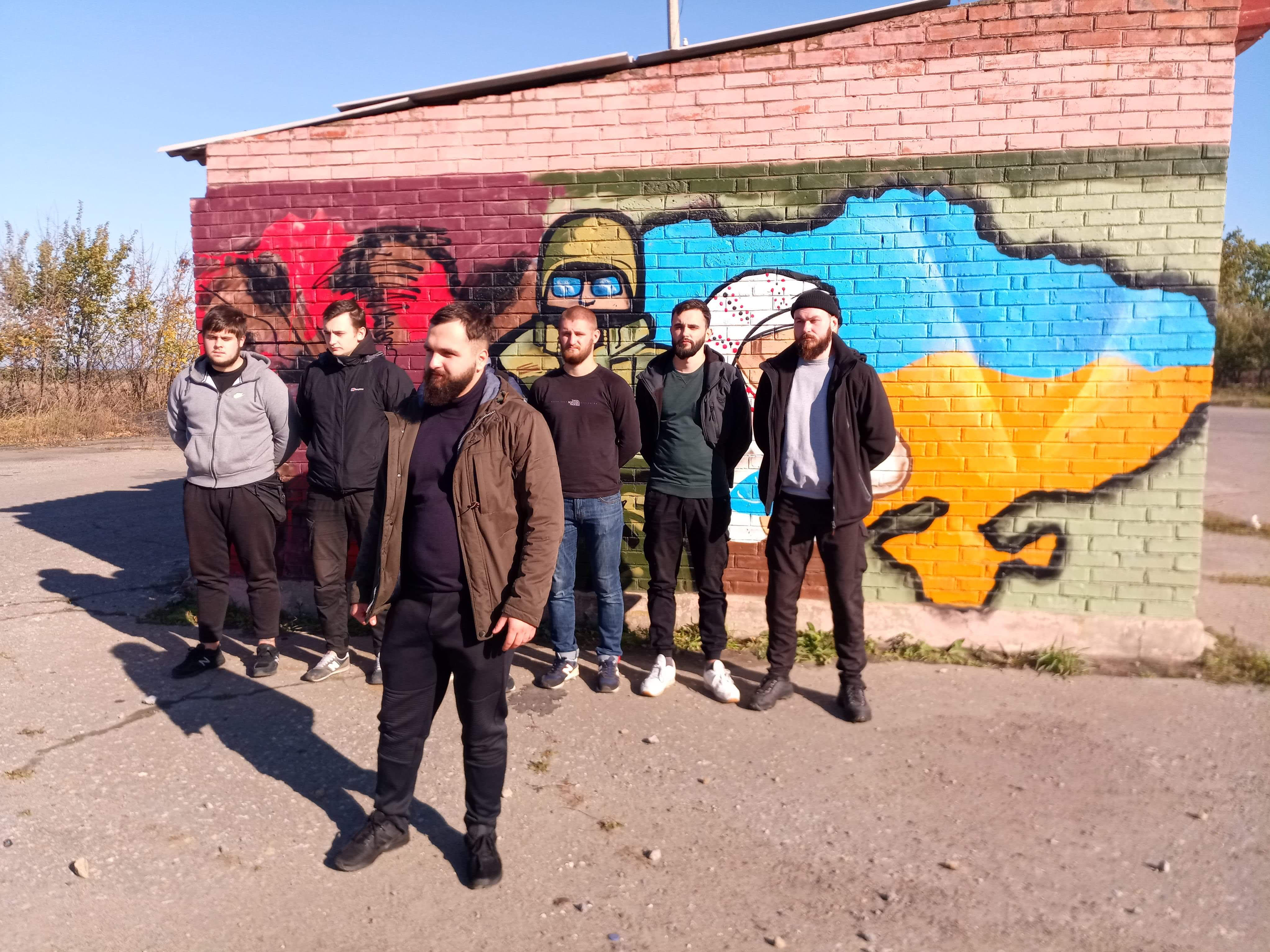 Впрочем, члены "Национального корпуса" в Золотом все же есть. С десяток их встречаю на перекрестке в городе – парни построились в шеренгу напротив раскрашенной патриотическим мини-муралом остановки и позируют для фотографа.