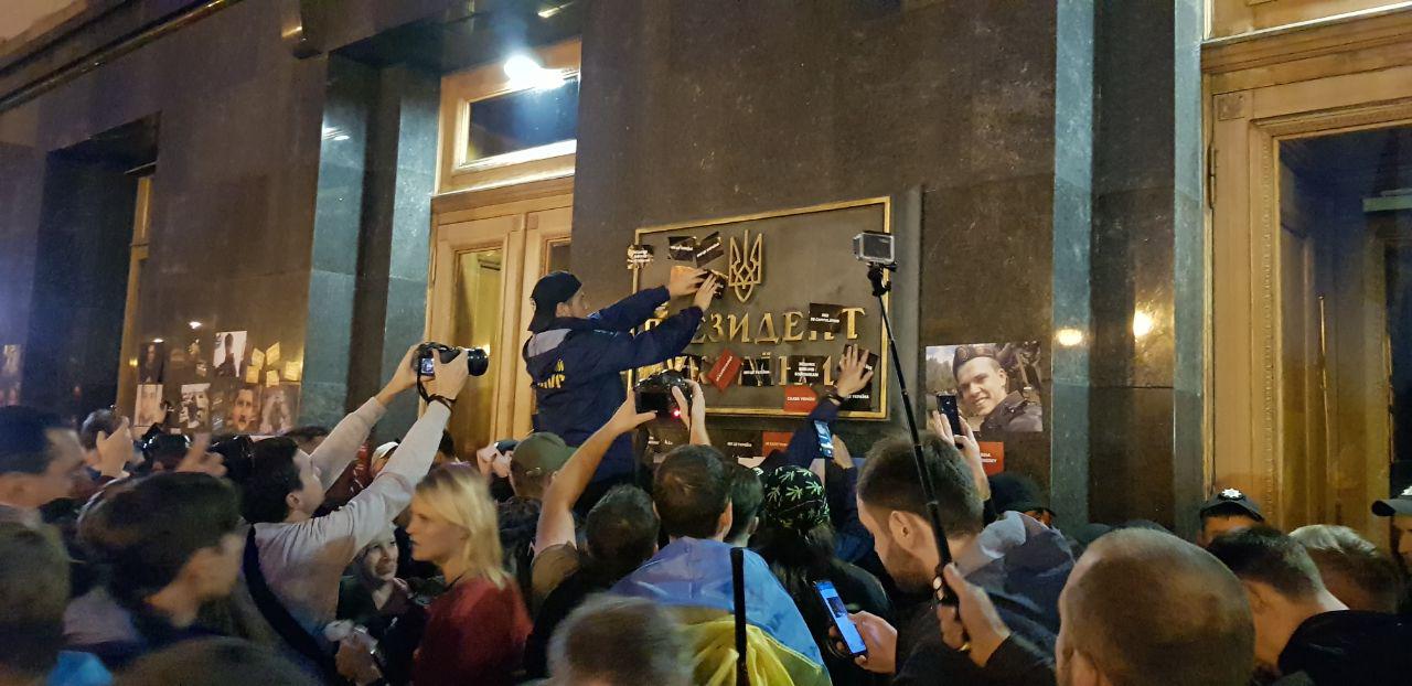 18:51  Активисты пришли к Офису президента, который сегодня уехал на Донбасс, и заклеивают его надписями "Слава Украине".