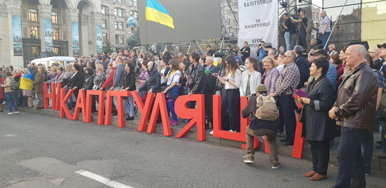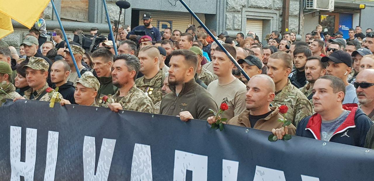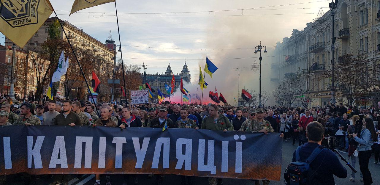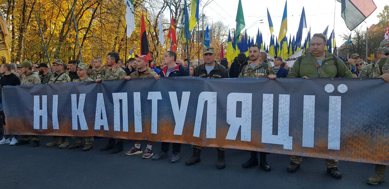 Видны флаги Правого сектора, Нацкорпуса. Колону возглавляют ветераны АТО с плакатом "Нет капитуляции".