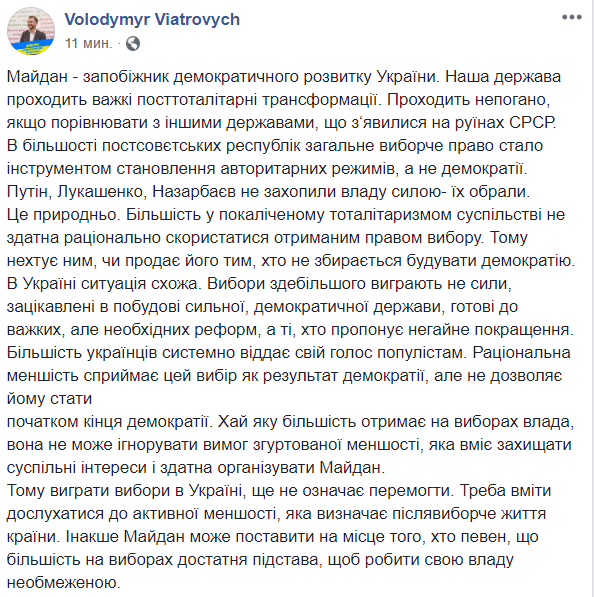 "Выиграть выборы в Украине, еще не значит победить. Надо уметь прислушиваться к активному меньшинству, которое определяет послевыборную жизнь страны. Иначе Майдан может поставить на место того, кто уверен, что большинство на выборах достаточное основание, чтобы делать свою власть неограниченной", - написал он в Facebook.