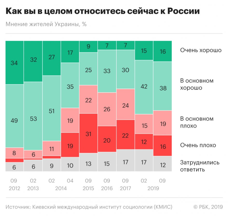 Отношение жителей Украины к России от февраля к сентябрю 2019 года существенно не изменилось. Если в феврале 2019 года хорошо к России относились 57% украинцев (15% очень хорошо и 42% в основном хорошо), то в сентябре - 54% (16% очень хорошо и 38% в основном хорошо).