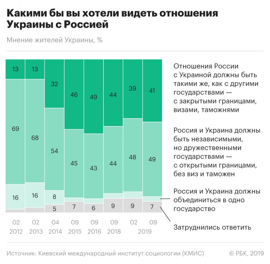 Избрание Владимира Зеленского президентом Украины в апреле этого года и первые шаги на взаимодействие (в том числе произошедший обмен удерживаемыми лицами) переломили доминирование "плохого" отношения россиян к соседней стране", - предположила социолог "Левада-центра" Карина Пипия и добавила, что такое негативное отношение сохранялось в "посткрымский" период.