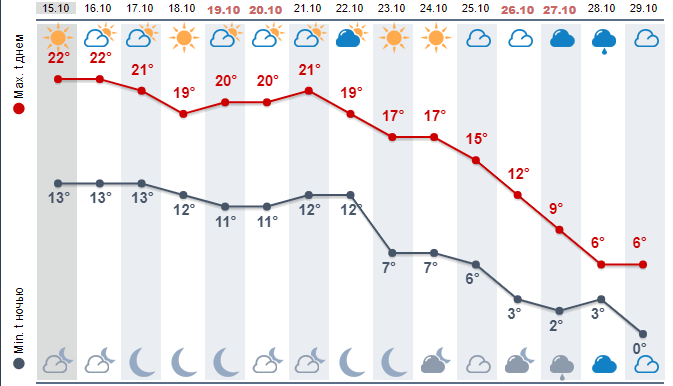 Прогноз Мeteoprog.ua показывает, что в ближайшие 10 дней днем термометры будут показывать в среднем +19...+22. Ночью +11...+13. Похолодание начнется с 25 октября. С этого дня небо затянут тучи, а температура воздуха постепенно опустится с +15 до +6. А ночью 29 октября ночью температура спустится до 0.