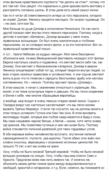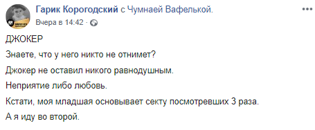 "Джокер". Знаете, что у него никто не отнимет? Джокер не оставил никого равнодушным. Неприятие либо любовь. Кстати, моя младшая основывает секту посмотревших 3 раза. А я иду во второй", - написал Корогодский.