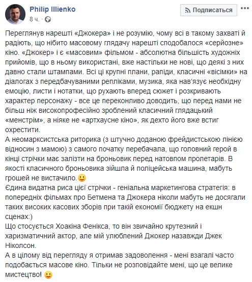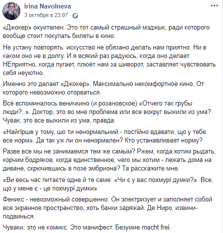 "Итак, "Джокер". Как по мне, это шедевр. Идти обязательно. Даже если не быть фанатом комиксов и не знать кто такой Джокер и почему ему противостоит Бэтмен, фильм впечатляет. Хотя и тяжелый, сказать честно. Подготовить себя историей героя комиксов стоит, если вы не в теме. Но кино поражает и как самоценное произведение искусства. Хоакин Феникс, его игра, пластика, режиссура, драматургия, красота каждого кадра, саундтрек.