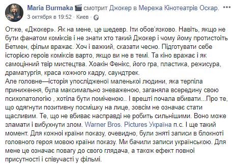 Но главное - история униженного маленького человека, который терпел унижения, был максимально презираемым, загонял внутрь свою психопатологию, хотел быть замеченным .. И наконец начал убивать ... О том, что надеть положительную улыбку на лицо, вовсе не означает стать счастливым. То, что не убивает на самом деле не делает сильнее. Оно может сломать и взорваться злом... И еще такой момент. Для каждой страны показа, очевидно, были сняты записи в блокноте главного героя на языке страны показа. Мы видели записи на украинском. Для меня это означает уважение к своему зрителю, а также эффект полного присутствия и соучастия в фильме" - написала Мария Бурмака.