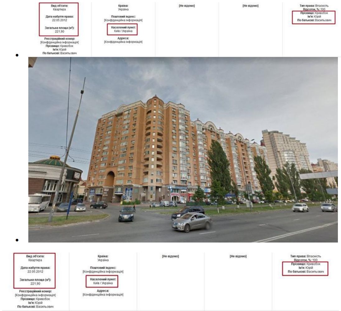 В декларации 2015 года Кривобок указал, что в собственности его жены находится 3 квартиры в селе Софиевская Борщаговка. Именно на месте этих квартир в 2009-2010 годы, когда он работал прокурором Оболонского района Киева, его родители и жена получили в собственность 16 гектаров земли.