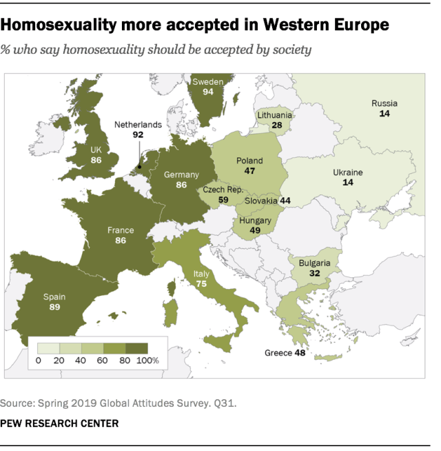 По мнению социологов, отношение, в том числе, к этой теме отражает резкое разделение между Востоком и Западом. Исследователи отмечают, что в Западной Европе люди выражают гораздо более прогрессивные взгляды.