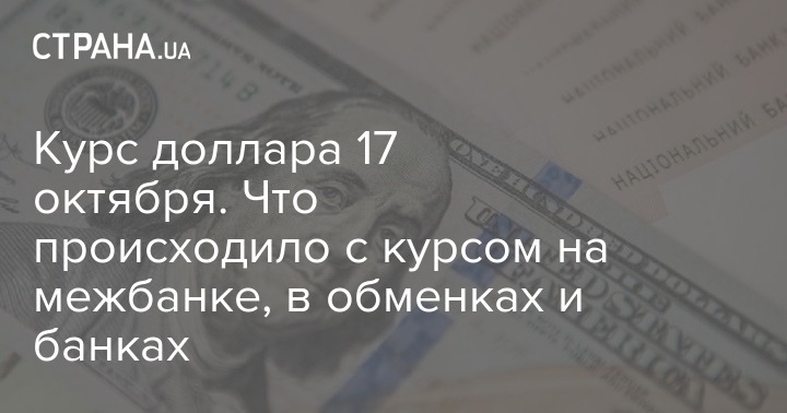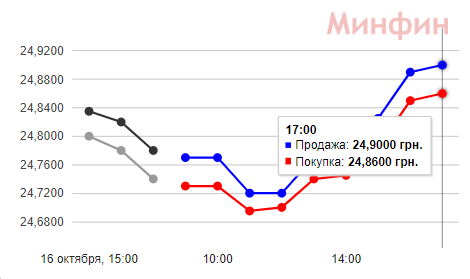 17 октября курс доллара в обменках подорожал на 5 копеек: покупка - 24,85 грн, продажа - за 24,90 грн. Межбанк закрылся подорожанием на 12 копеек: покупка - 24,86 грн, продажа - 24,90 грн. В банках вечером доллар покупают от 24,50 до 24,85 грн, продают от 24,85 до 25,45 грн.