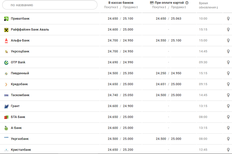 В банках курс доллара с утра был такой: покупка от 24,5 до 24,75 грн, продажа - от 24,9 до 25,1 грн.