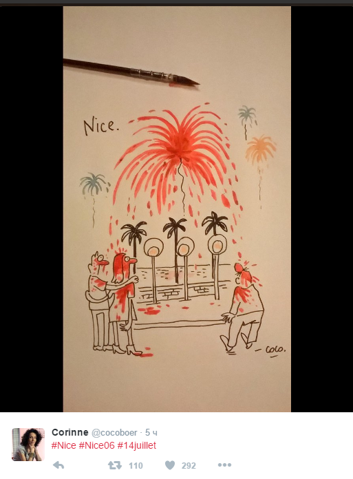 На картинке изображена набережная в Ницце, кровавый салют и шокированные люди в каплях крови. За исключением названия города и подписи художницы Коко, текста на рисунке нет.