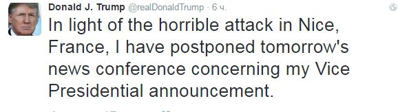 8.27 - Кандидат на пост президента США от Республиканской партии Дональд Трамп из-за теракта в Ницце отложил объявление имени своего кандидата в вице-президенты. "В свете ужасной атаки во французской Ницце я откладываю пресс-конференцию, касающуюся объявления моего кандидата в вице-президенты", —написал Трамп в Twitter.