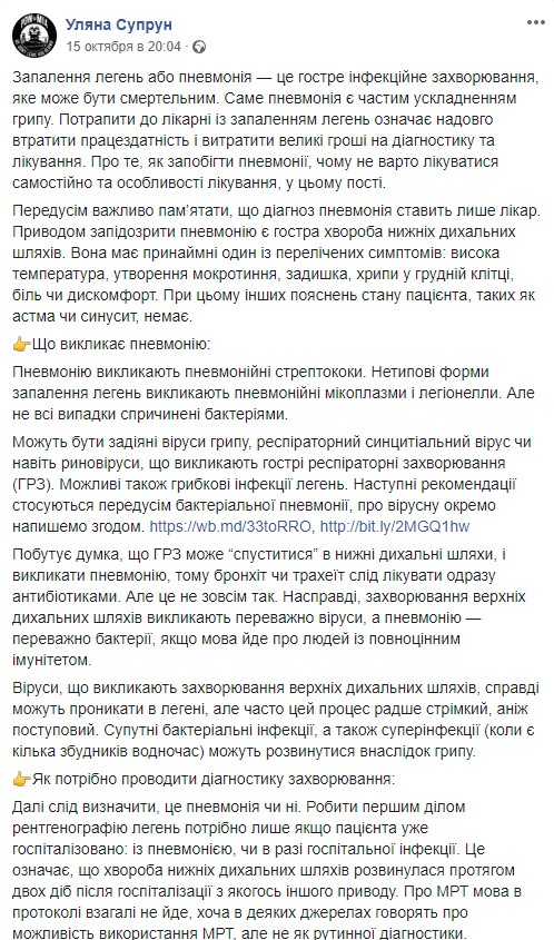 Бывшая глава министерства здравоохранения Ульяна Супрун рассказала о воспалении легких и как предотвратить это острое инфекционное заболевание. Об этом она сообщила на своей странице в соцсети Facebook.