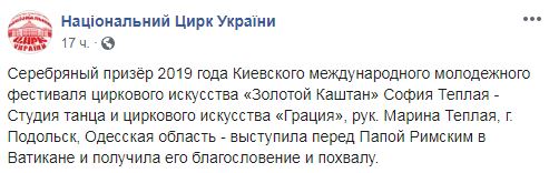 "Серебряный призер 2019 года Киевского международного молодежного фестиваля циркового искусства "Золотой Каштан" София Теплая - студия танца и циркового искусства "Грация", город Подольск, Одесская область - выступила перед Папой Римским в Ватикане и получила его благословение и похвалу", - сказано в сообщении.
