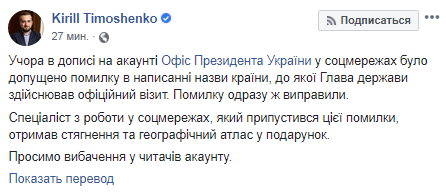 "Вчера в заметке на аккаунте Офис Президента Украины в соцсетях была допущена ошибка в написании названия страны, в которой глава государства осуществлял официальный визит. Ошибку сразу же исправили", - написал Тимошенко.