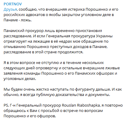 "Панамский прокурор лишь временно приостановил расследование. И если Генеральная прокуратура Украины отреагирует на лежащее в её недрах мое обращение по отмыванию Порошенко преступных доходов в Панаме, расследование в этой стране продолжится", - написал Портнов.