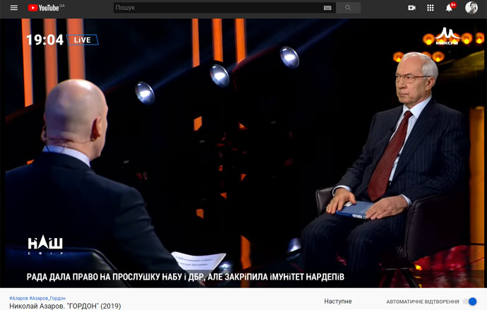 Речь идет о передаче "Гордон" за 5 октября 2019 года, гостем которой был виртуальный Азаров.