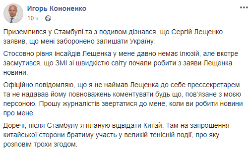 Однако уже около полуночи Игорь Кононенко на своей странице в Facebook сообщил, что он уже приземлился в Стамбуле и с удивлением узнал о сообщениях Лещенко.
