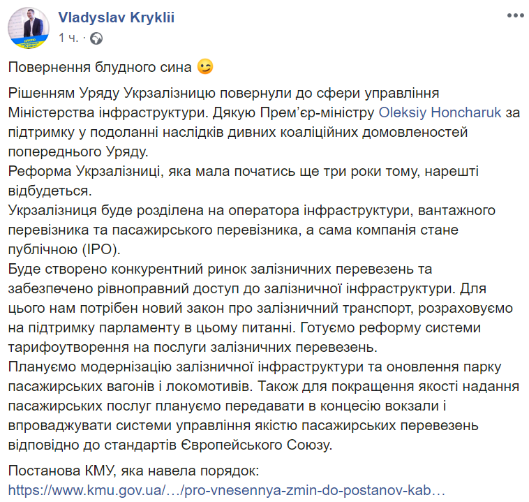 "Решением правительства "Укрзализныцю" вернули в сферу управления Министерства инфраструктуры. Реформа "Укрзализныци", которая должна была начаться еще три года назад, наконец-то состоится", - написал министр.