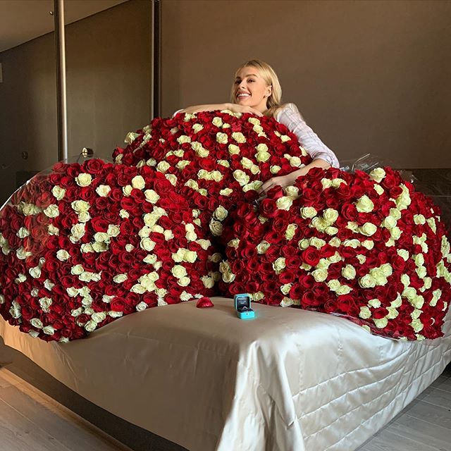 Футболист оформил предложение, встав на одно колено. Свой спутнице он протянул  обручальное кольцо и несколько огромных букетов алых и белых роз.
