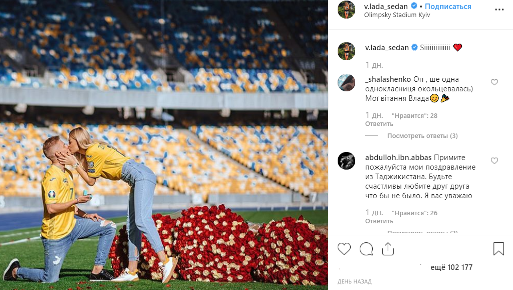 Футболист национальной сборной Украины и "Манчестер Сити" Александр Зинченко сделал предложение руки и сердца своей девушке - телеведущей спортивных каналов "Футбол 1" и "Футбол 2" Владе Седан на стадионе "Олимпийский". Это случилось вскоре после яркой победы Украины в матче против Португалии и выхода сборной на Евро-2020.
