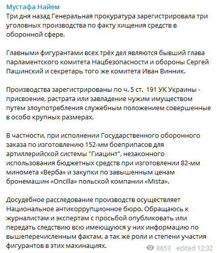 "Досудебное расследование производств осуществляет Национальное антикоррупционное бюро. Обращаюсь к журналистам и экспертам с просьбой опубликовать или передать следствию всю имеющуюся у них информацию по вышеперечисленным фактам, а так же роли и степени участия фигурантов в этих махинациях", - написал Найем.