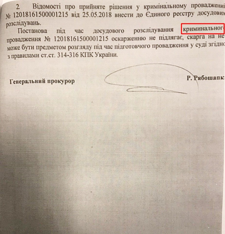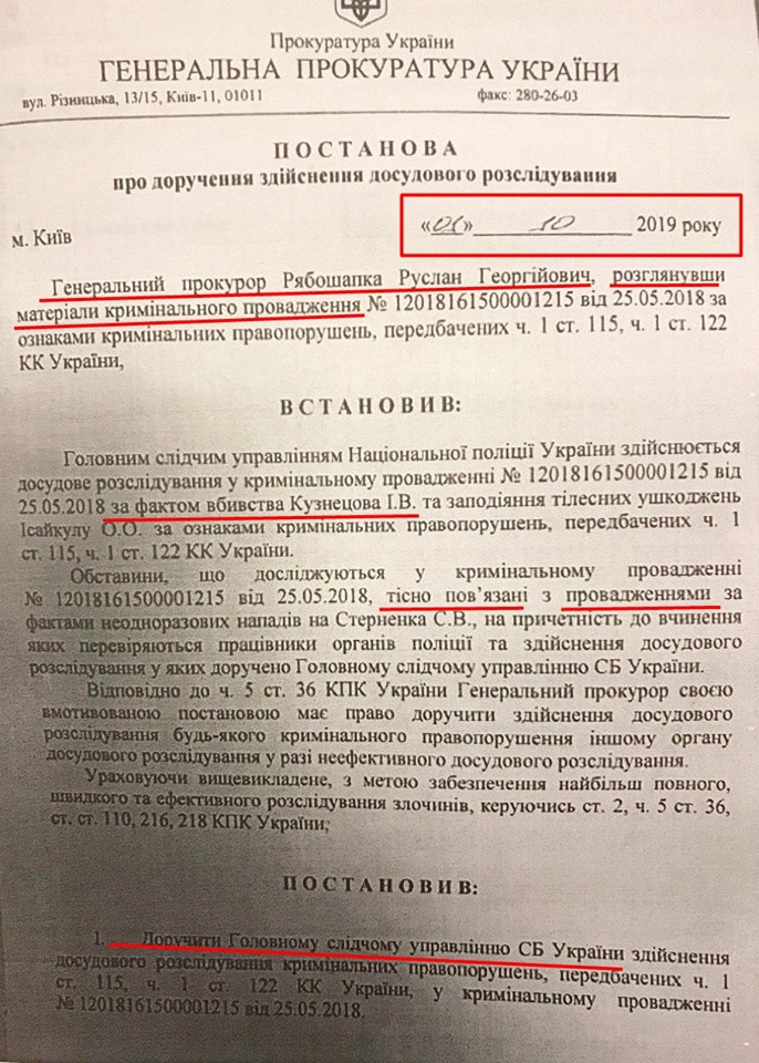 Экс-министр юстиции Украины Елена Лукаш обнародовала постановление генпрокурора Руслана Рябошапки, подписанное собственноручно, которым он отправил расследованное дело радикала Сергея Стерненко в Главное следственное управление СБУ. Документ Лукаш опубликовала в своем Facebook.