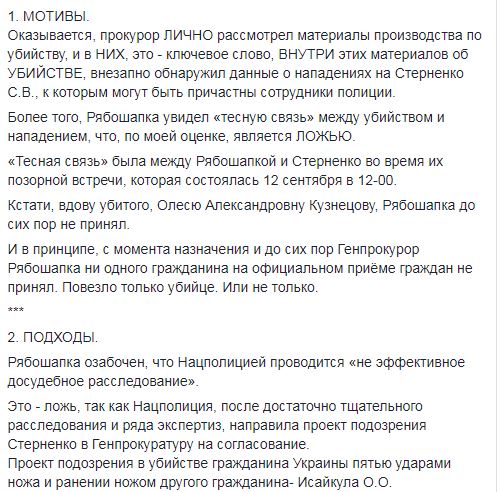 "Оказывается, прокурор ЛИЧНО рассмотрел материалы производства по убийству, и в НИХ, это - ключевое слово, ВНУТРИ этих материалов об УБИЙСТВЕ, внезапно обнаружил данные о нападениях на Стерненко С.В., к которым могут быть причастны сотрудники полиции. Более того, Рябошапка увидел "тесную связь" между убийством и нападением, что, по моей оценке, является ЛОЖЬЮ", - пишет она.