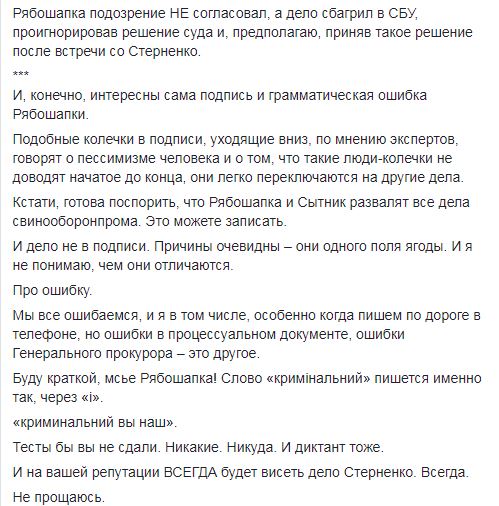 И добавляет, что "тесная связь" была между Рябошапкой и Стерненко "во время их позорной встречи, которая состоялась 12 сентября в 12:00". Он отмечает, что вдову убитого, Олесю Кузнецову, Рябошапка до сих пор не принял.