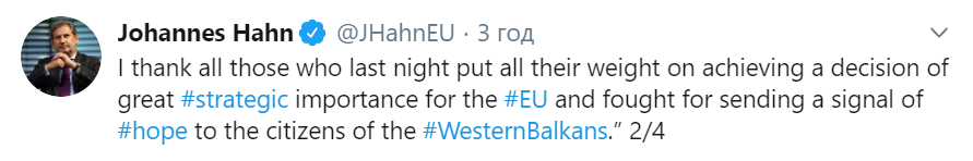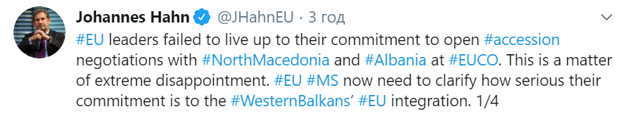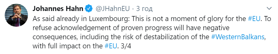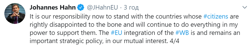 "Теперь мы обязаны поддерживать страны, граждане которых справедливо разочарованы. Интеграция Западных Балкан в ЕС есть и остается важной стратегической политикой в ​​наших общих интересах", - добавил еврокомиссар Хан.