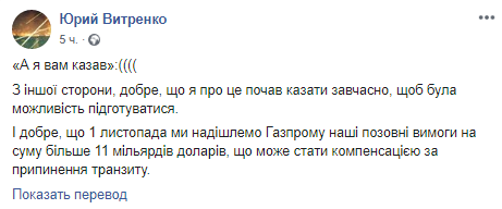 "А я вам говорил :(((( С другой стороны, хорошо, что я об этом начал говорить заранее, чтобы была возможность подготовиться. И хорошо, что 1 ноября мы вышлем Газпрома наши исковые требования на сумму более 11 млрд долларов, что может стать компенсацией за прекращение транзита", - написал Витренко.