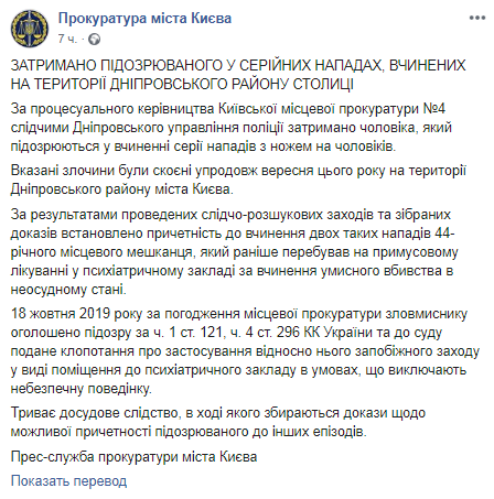 В сентябре этого года на территории Днепровского района Киева была совершена серия нападений на местных жителей. Правоохранители установили ​​причастность к совершению двух таких нападений 44-летнего местного жителя, который ранее находился на принудительном лечении в психиатрическом учреждении за совершение умышленного убийства в невменяемом состоянии.