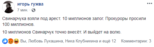16:57 Главный редактор "Страны" Игорь Гужва уверен, что 10 миллионов Свинарчук точно найдет, поэтому совсем скоро выйдет на волю.