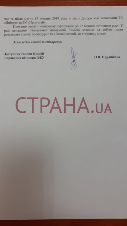 Учитывая указанное, ФБУ просит предоставить официальную позицию клуба относительно поведения Игоря Коломойского как зрителя и болельщика БК "Днепр" до 22 октября.