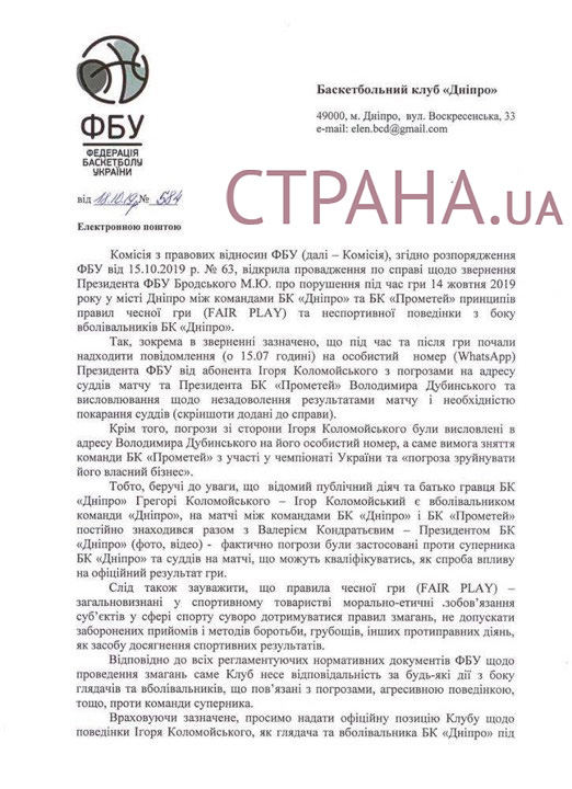 Так, в частности, в обращении указано, что во время и после игры начали поступать сообщения (в 15.07 часов) на личный номер (WhatsАрр) президента ФБУ от абонента Игоря Коломойского с угрозами в адрес судей матча и президента БК "Прометей" Владимира Дубинского, а также высказывания относительно недовольства результатами матча и необходимости наказания судей.