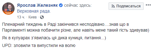 "Пленарная неделя в Раде закончилась неожиданно. Знал, что в парламенте можно увидеть разное, но даже меня такой гость удивил. Как в кулуарах появилась эта дикая куница, вопрос", - написал политик в сети.