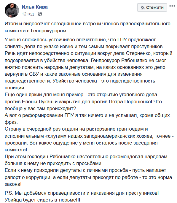 "У меня сложилось устойчивое впечатление, что ГПУ продолжает сливать дела по указке извне и тем самым покрывает преступников. Речь идёт непосредственно о ситуации вокруг дела Стерненко, который подозревается в убийстве человека. Генпрокурор Рябошапка не смог внятно пояснить народным депутатам, на каких основаниях это дело вернули в СБУ и какие законные основания для изменения подследственности. Убийство человека - это подследственность полиции.