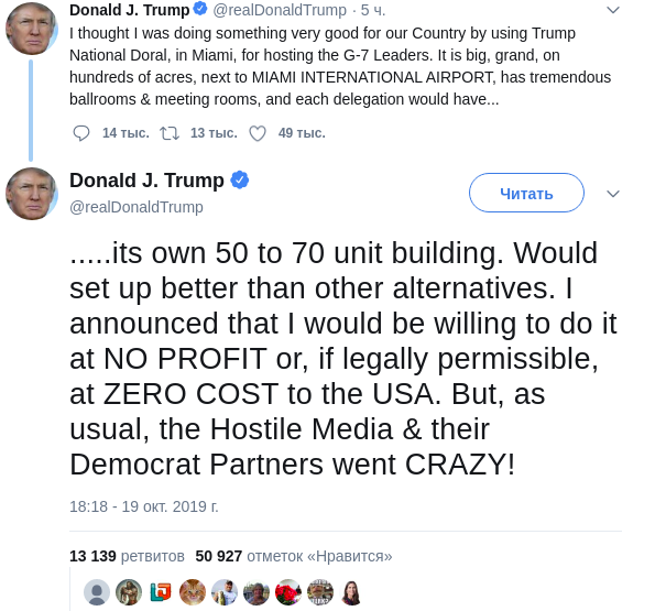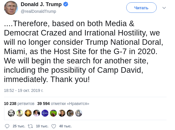 "Таким образом, из-за безумия и вражды СМИ и демократов, мы больше не будем рассматривать Trump National Doral как место проведения саммита G7. Мы начнем поиск другого места, возможно это будет Кэмп-Дэвид (резиденция президента - Ред.)."