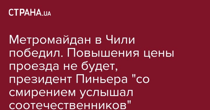 Президент Чили Себастьян Пиньера отменил повышение цены на проезд в метро, из-за которой начались массовые беспорядки. Президент отменил повышение меньше, чем через день после того, как ввел чрезвычайное положение в столице страны. Об этом сообщает DW.