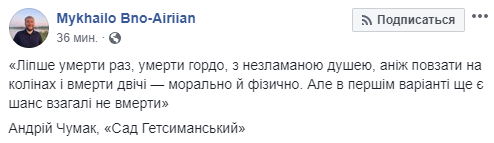Также чиновник процитировал отрывок из романа украинского писателя Ивана Багряного "Сад Гефсиманский": "Ліпше умерти раз, умерти гордо, з незламаною душею, аніж повзати на колінах і вмерти двічі - морально й фізично. Але в першім варіанті ще є шанс взагалі не вмерти".