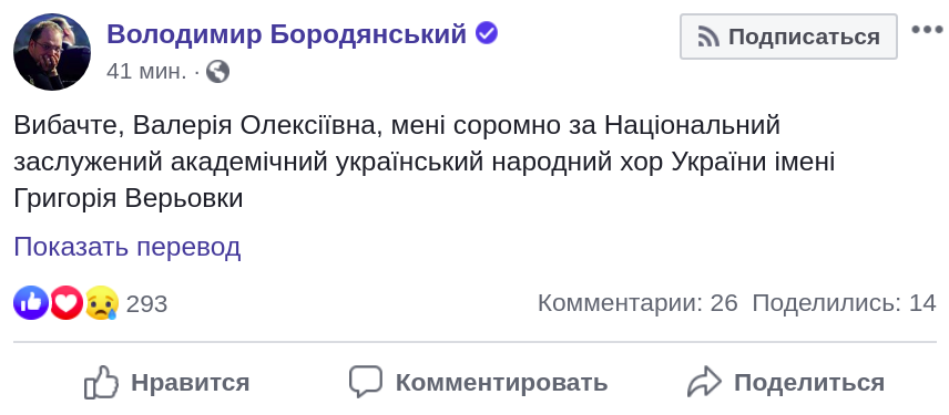 "Простите, Валерия Алексеевна, мне стыдно за Национальный заслуженный академический украинский народный хор Украины имени Григория Веревки", - написал министр культуры в Facebook.