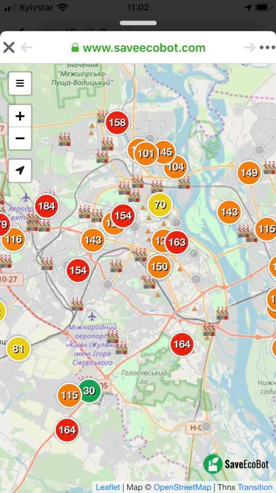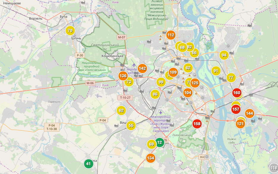 А вот данные этой онлайн-платформы по состоянию на 13:00 21 октября. Самое сильное превышение по Киеву фиксируют на улице Регенераторной (160), на проспекте Науки (158), на улице Урловской (157). Также высокая концентрация на улице Ревуцкого (144), в районе Святошино (142).