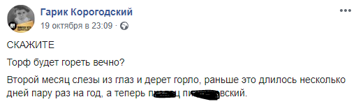"Скажите торф будет гореть вечно? Второй месяц слезы из глаз и дерет горло, раньше это длилось несколько дней пару раз на год, а теперь п@ц п@цовский" - написал он.