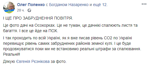 Глава комитета ЖКХ, благоустройства, экологии и охраны окружающей среды в Общественном совете при КГГА Олег Попенко обнародовал фото, на котором виден дым от того, что дачники на Осокорках жгут листья и так происходит по всей стране.