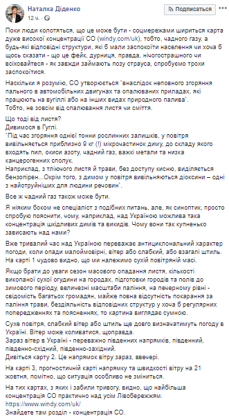 Но не все верят в то, что проблему вызвало сжигание листьев. СЕО GT Energy Евгений Сойкин написал в Facebook, что распространение угарного газа фактически останавливается на границе Киевской и Житомирской областей.