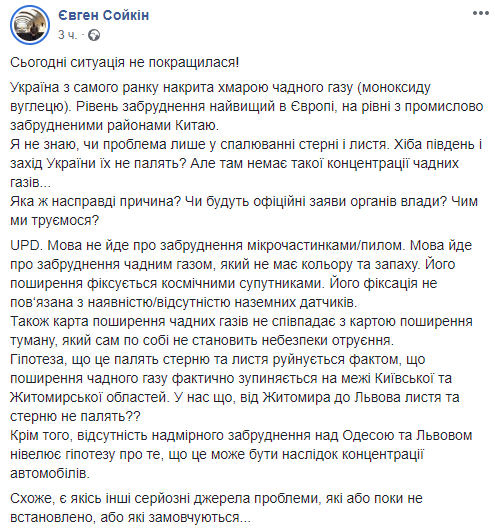 "У нас что, от Житомира до Львова листья и стерню не жгут? Кроме того, отсутствие чрезмерного загрязнения над Одессой и Львовом нивелирует гипотезу о том, что это может быть следствие концентрации автомобилей. Похоже, какие-то другие серьезные источники проблемы, или пока не установлено, или которые замалчиваются..." - предположил он.