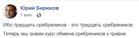 "Теперь мы знаем курс обмена сребреников к гривне", - пишет экс-советник Порошенко Юрий Бирюков, говоря о гонораре в 30 тысяч гривен для хора Веревки.