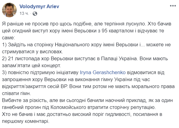 Нардеп от "Европейской солидарности" Владимир Арьев призвал атаковать аккаунты хора в соцсетях и минусовать им рейтинг.