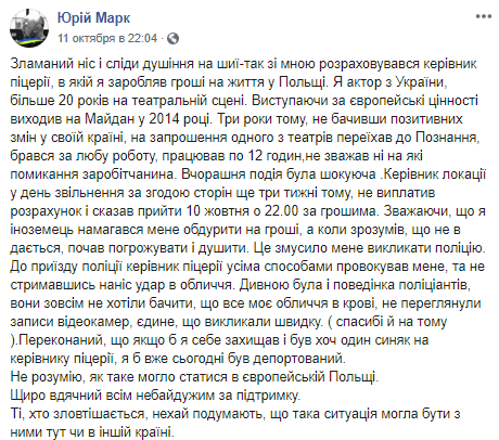 "Я уверен, что если бы я себя защищал и на лице руководителя пиццерии был бы хоть один синяк, меня бы уже сегодня депортировали", – написал Юрий.