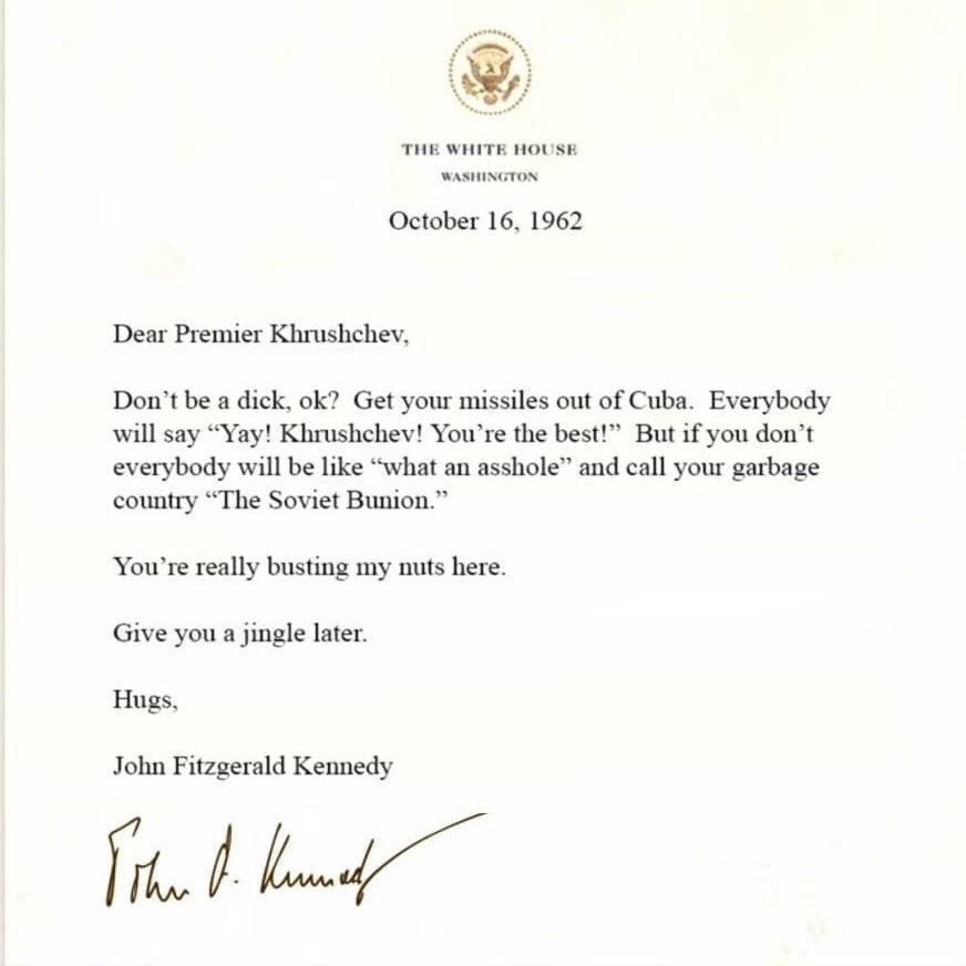 В тексте звучит призыв выполнить американские требования. "Дорогой премьер Хрущев. Не будь мудаком, ок? Убирайте свои ракеты с Кубы. Все скажут: "Ура, Хрущев, ты лучший". Но если ты этого не сделаешь, все такие "Какой же придурок!". После этого Кеннеди якобы говорит, что этими действиями Хрущев "сдавил его орешки" и обещает позже "звякнуть".